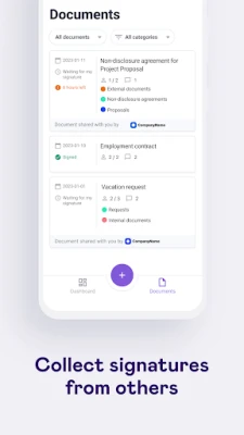 Potrebno vam je više potpisa? Dokobit pojednostavljuje proces prikupljanja saglasnosti od drugih strana. Lako dodajte potpisnike u dokument, a oni će istog trenutka primiti pozivnicu putem e-pošte. Vaša sigurnost je prioritet: pristup dokumentu je strogo kontrolisan i omogućen je isključivo ovlašćenim osobama nakon potvrde identiteta putem eID-a. Pored toga, Dokobit nudi robustan sistem za upravljanje dokumentima, omogućavajući vam da ih organizujete u logičke kategorije, što olakšava kasnije pretraživanje i pronalaženje važnih akata.